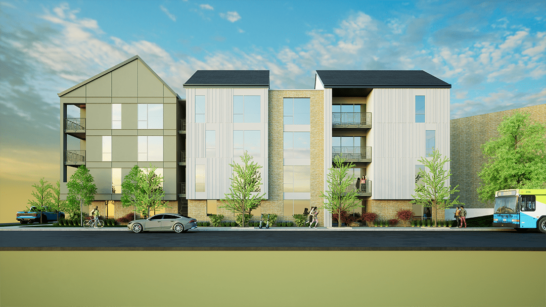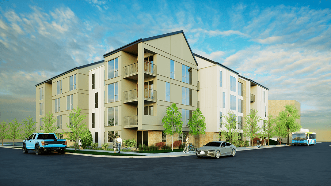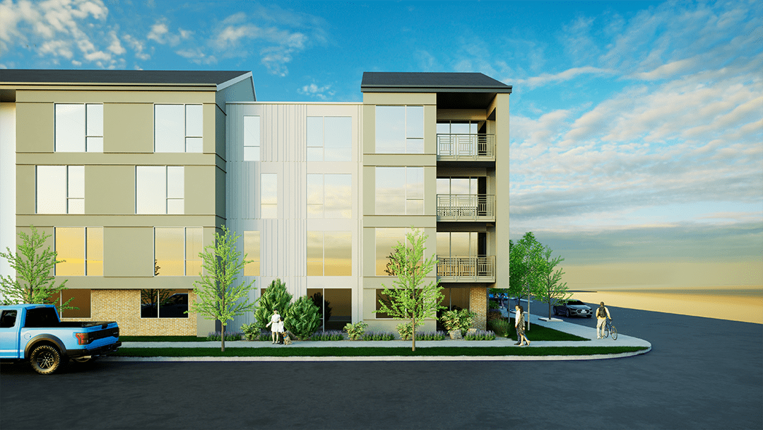 District Lofts at Garland is a four-story, 44-unit apartment building located next to the historic Garland Theater. Situated within Spokane’s Centers and Corridors zoning, the project thoughtfully responds to the city’s design standards, contributing to a walkable, mixed-use neighborhood with active street frontage. The building features off-set gables to both create interest and reflect back to the adjacent residential neighborhood. A brick base pays homage to the theater materiality; the base pulls back from the floors above to create a more welcoming public realm.