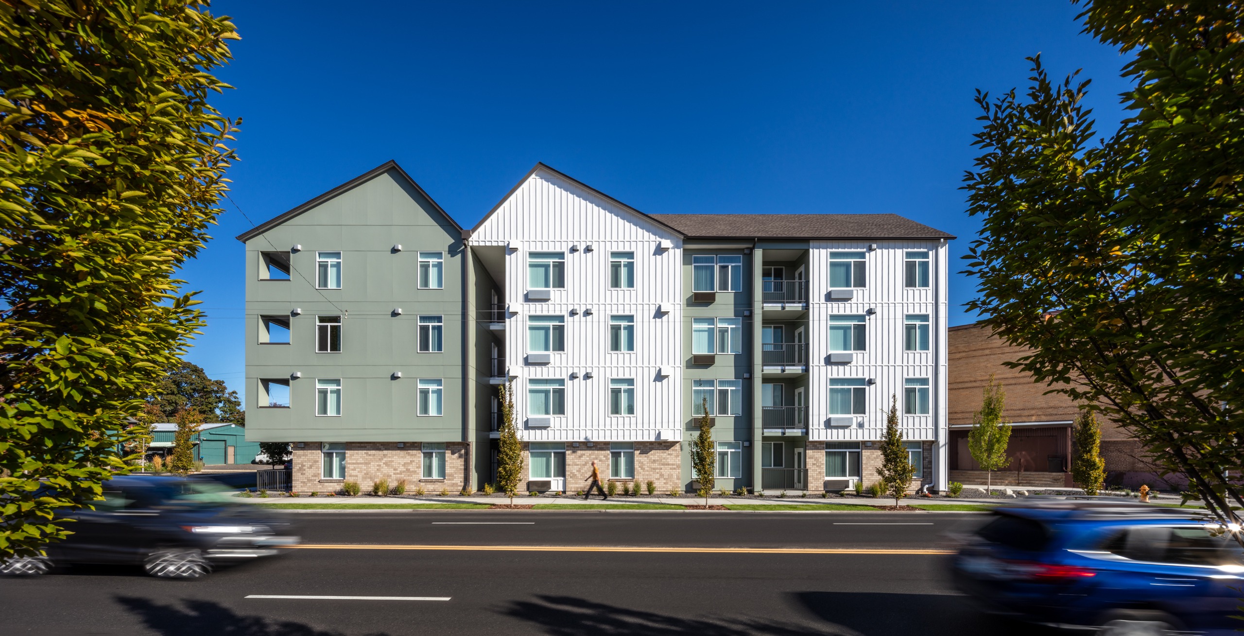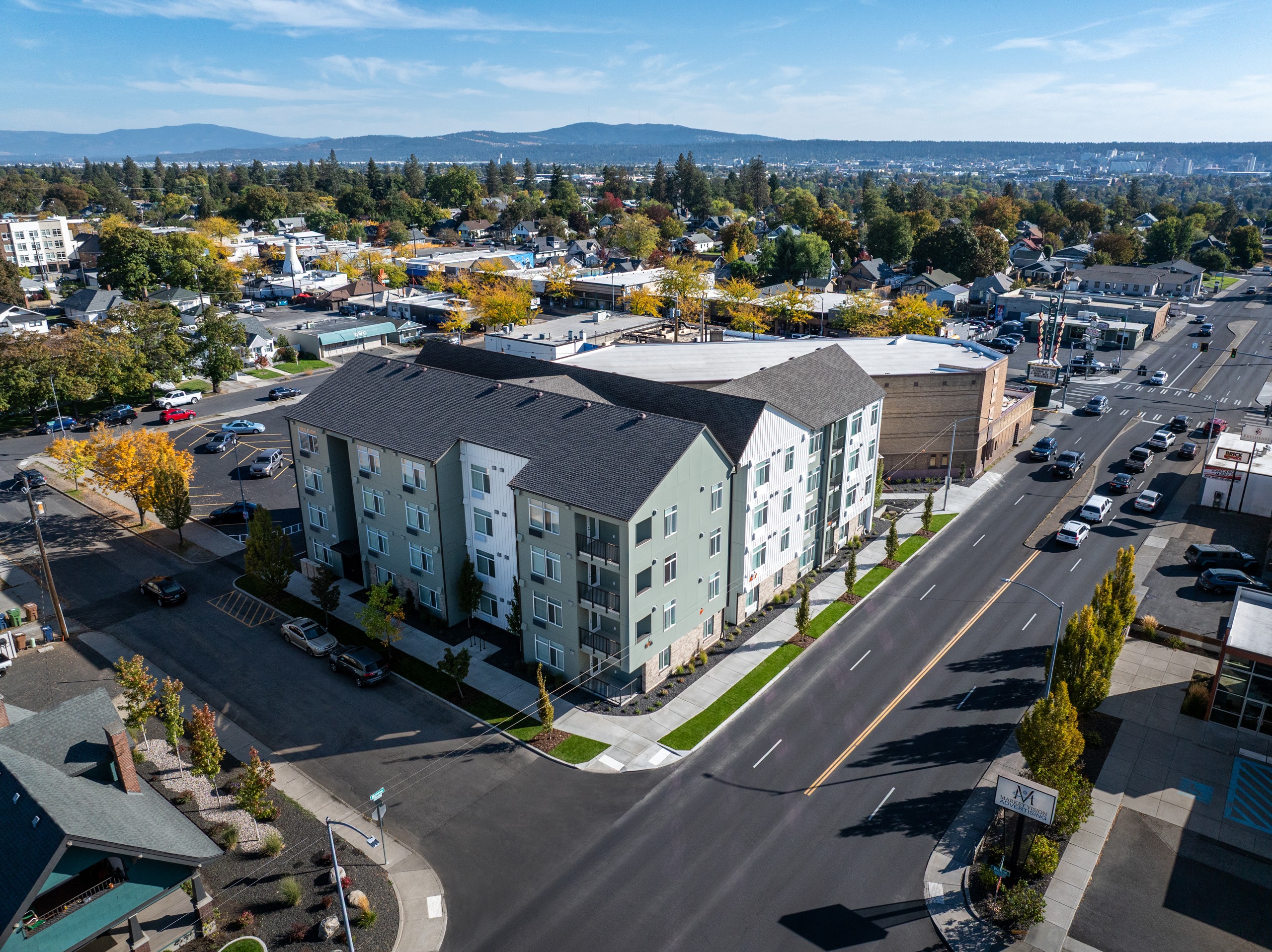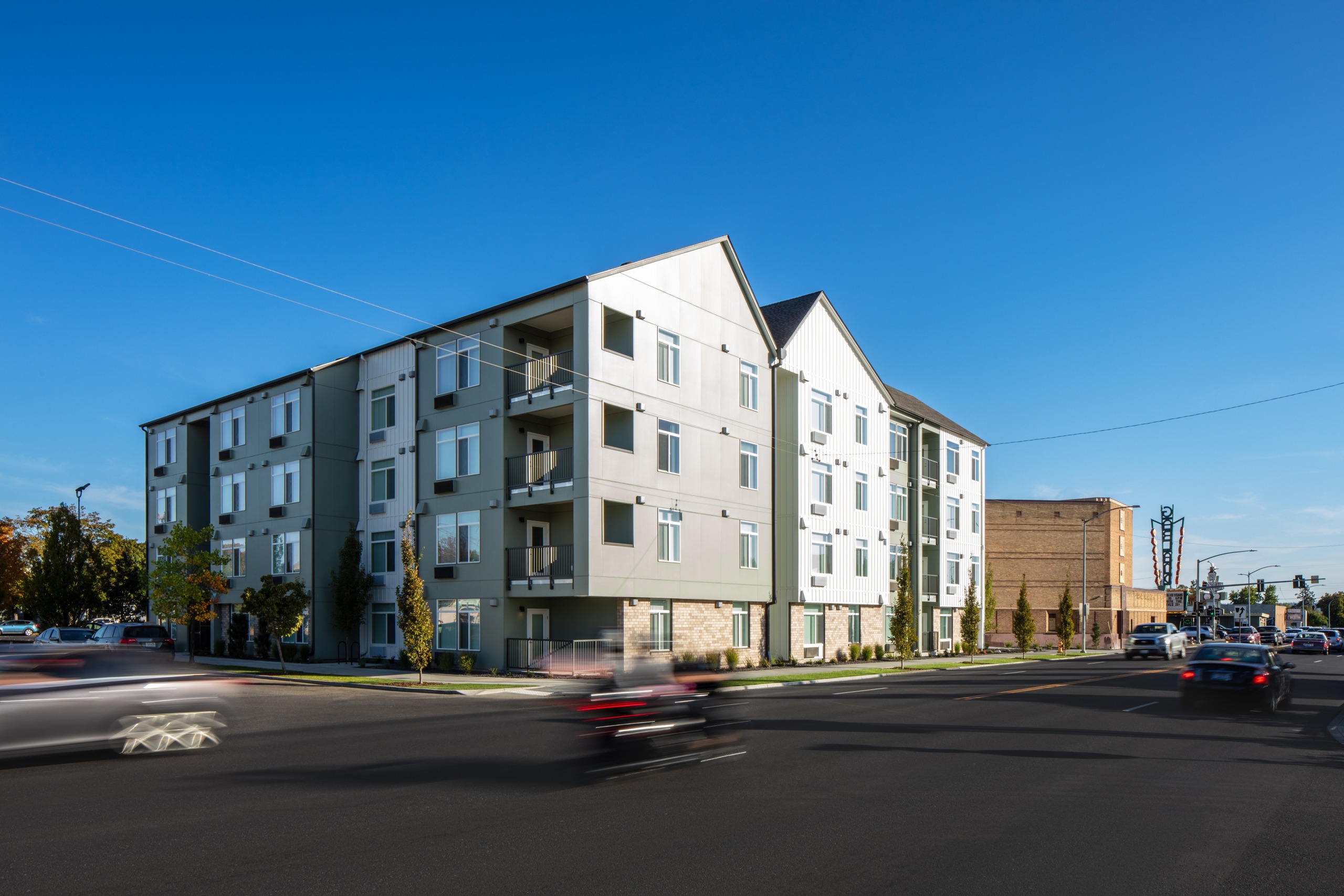 District Lofts at Garland is a four-story, 44-unit apartment building located next to the historic Garland Theater. Situated within Spokane’s Centers and Corridors zoning, the project thoughtfully responds to the city’s design standards, contributing to a walkable, mixed-use neighborhood with active street frontage. The building features off-set gables to both create interest and reflect back to the adjacent residential neighborhood. A brick base pays homage to the theater materiality; the base pulls back from the floors above to create a more welcoming public realm.